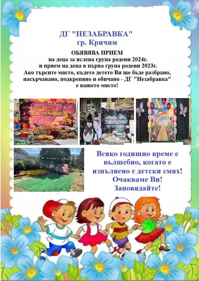 Уведомяваме Ви, че започва приемът на деца в яслена и първа група за учебната 2026/2027 година.
